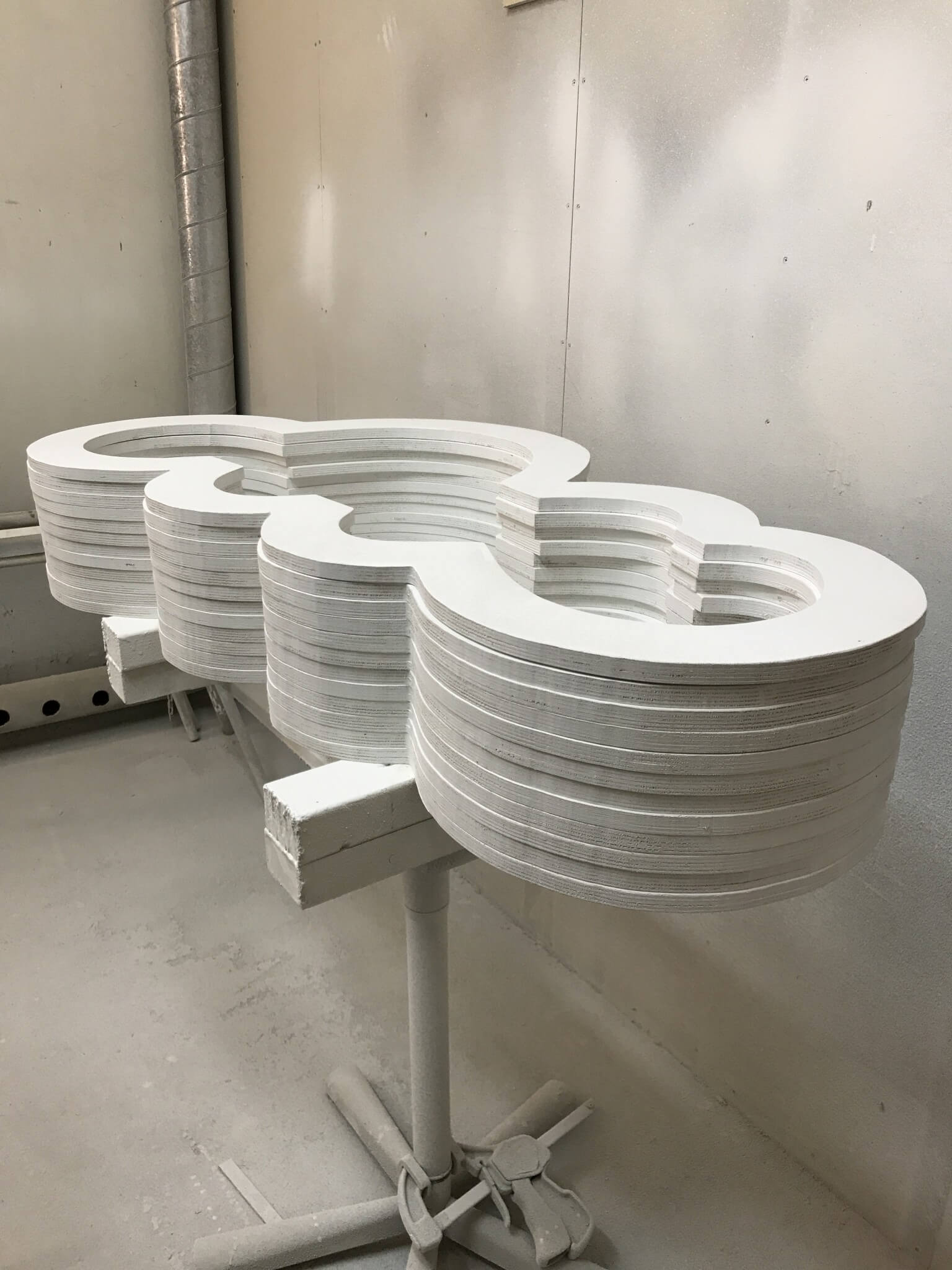 Vi plockar kläder, skär mattor, målar podier, kopplar ljusslingor, häftar tyll på moln och hänger dekor högt upp på en saxlift till långt in på natten.