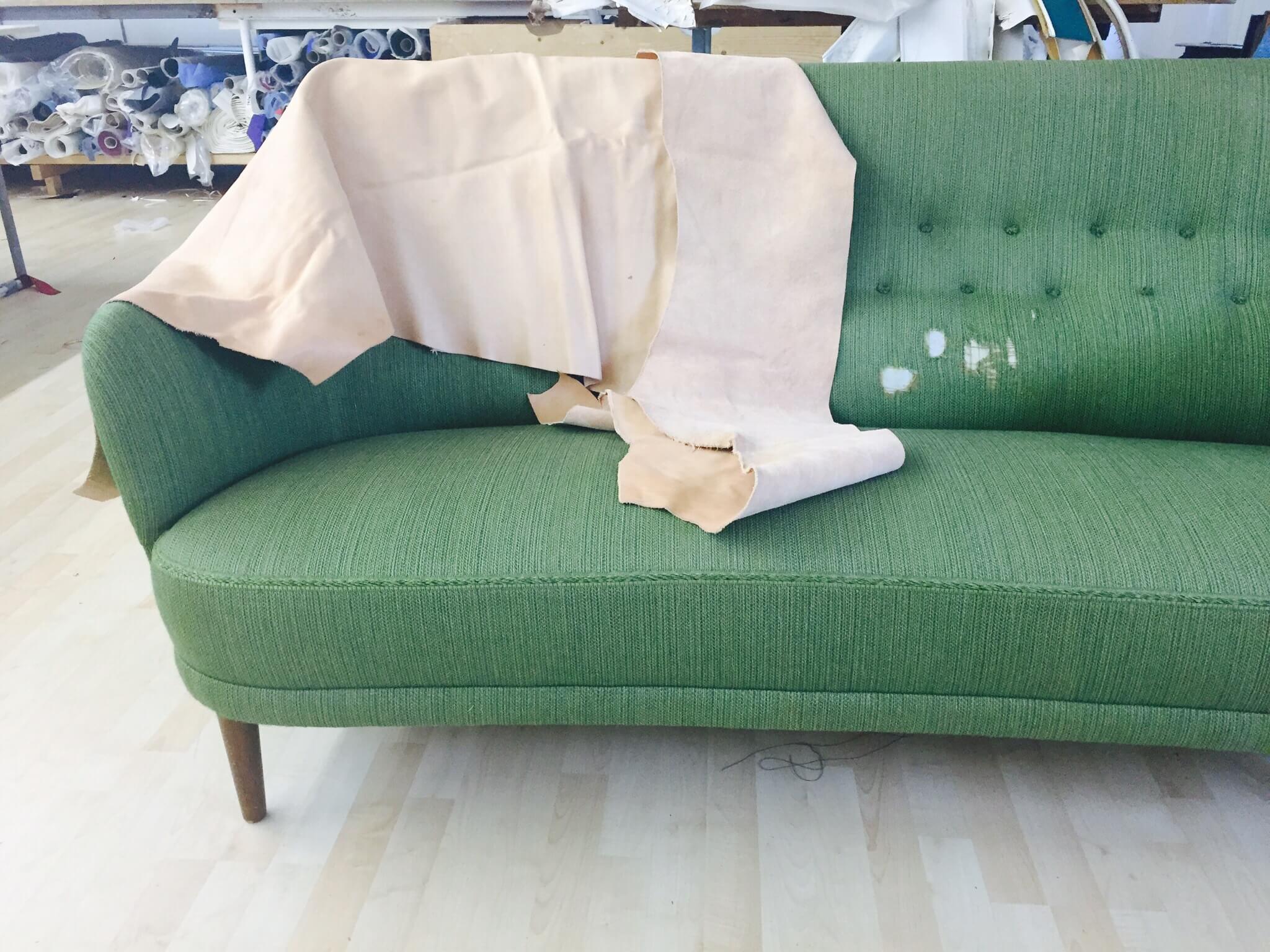 Vi började med att flytta Samsas soffan till Mats Sömmare för en riktig makeover! Vi snackar klädsel i obehandlat naturskinn, låta den få åldras med stil, den kommer bli en riktig skönhet.