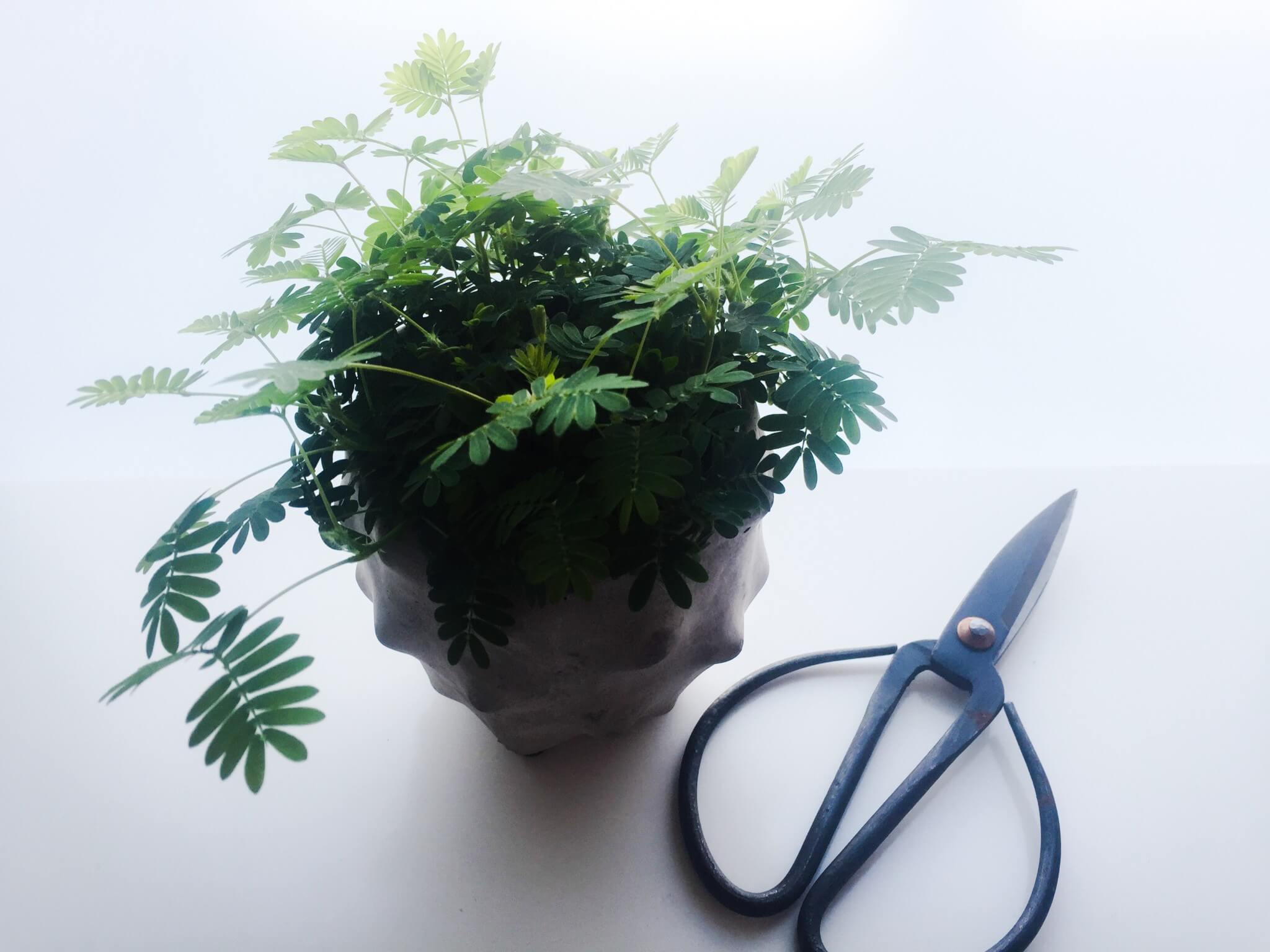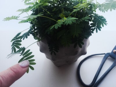 Bladen drar ihop sig när du rör vid den och på kvällen går den liksom och lägger sig. Den ska inte ha direkt solljus och gillar fuktigt klimat så lilla Sensitivia bor i vårt badrumsfönster.