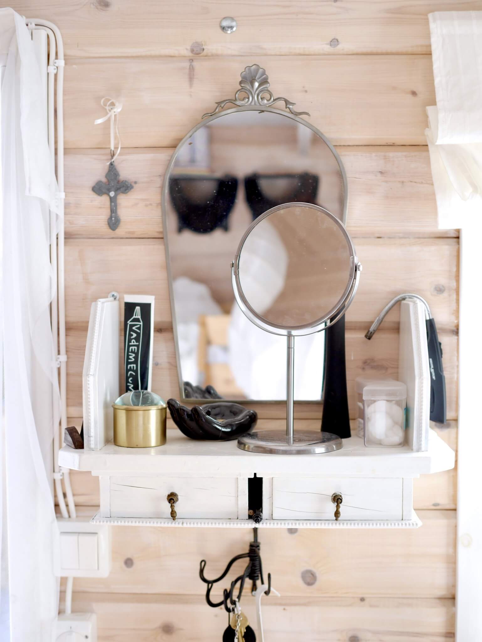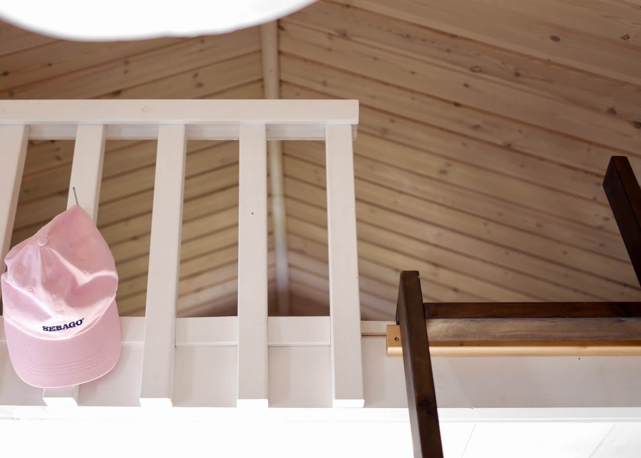 I en av stugorna huserar min lilla familj när vi är här (det lilla taket som sticker fram överst till vänster) . En liten stuga med loft. Det är svårt att hålla ordning bland alla handdukar, kläder och prylar som vi alla tre strör omkring oss så jag bjuder bara på några få bilder för allas bästa 🙂