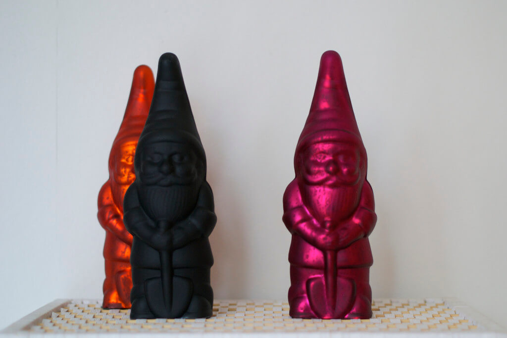 Tre små tomtar i granen svingar mellan ljus och änglavingar.
